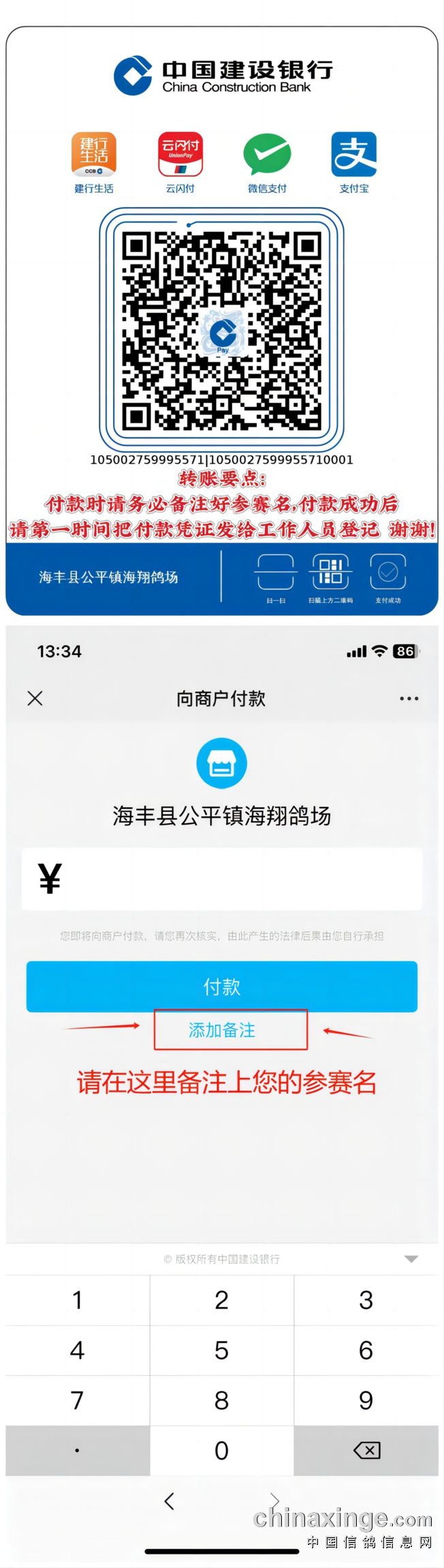 请扫描以下二维码,填写支付金额,并在“备注”里填写清楚鸽主参赛名,付款成功后截图发给海翔文员-小雪花(18128419823)或思思(18126929580)微信与手机同号;并附加微信说明报名环号、报名组别等!