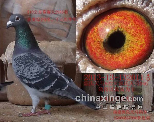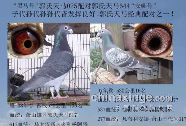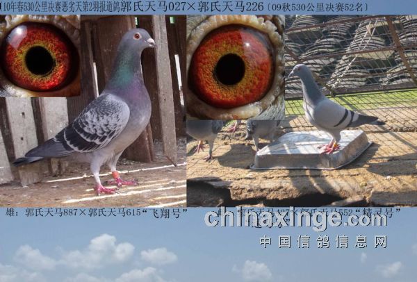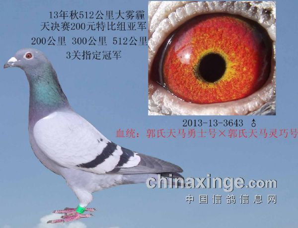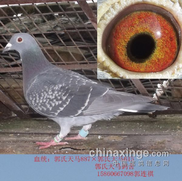 郭氏天马150,13年秋俱乐部510公里2965羽特比赛千元组亚军.此鸽除眼睛特点,其他特质上与“帼英号”非常相似。郭氏天马887ד飞翔号”《 同窝郭氏天马244千元组10名》