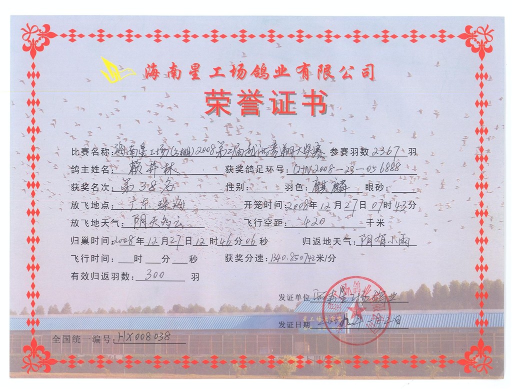 海南公棚38名奖状