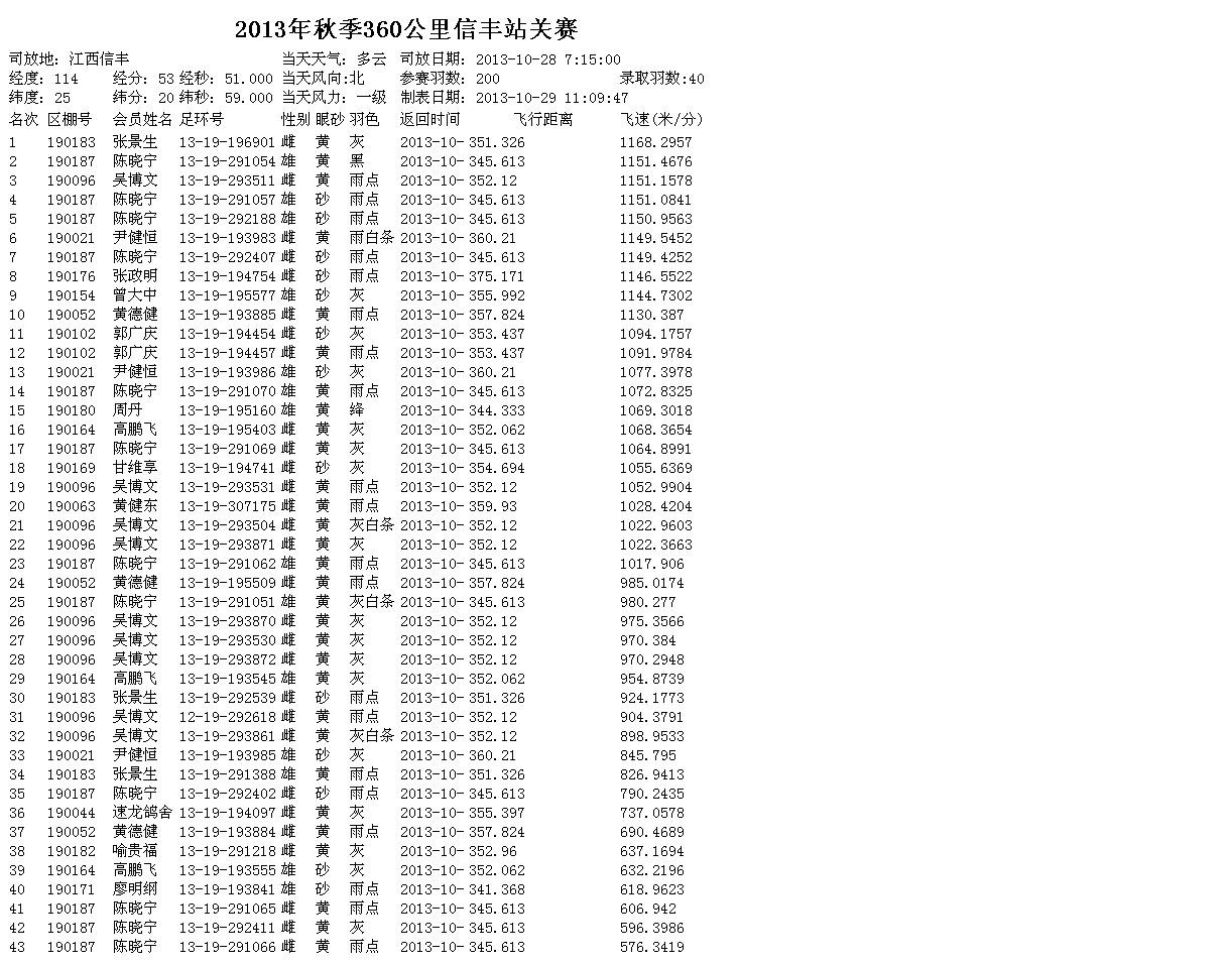 江门市鸽会2013年秋季360公里信丰站当年幼鸽赛成绩