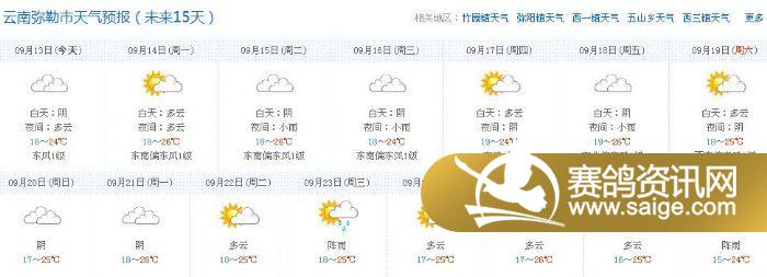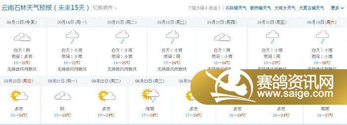 经查看天气预报,今天、明天、天气状况良好,决定按(训放计划)进行,今晚19:00上笼,明天上午(9月14日)司放石林火车站50公里。希望石林鸽友观摩。