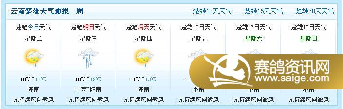 | 由于天气突变,司放地(楚雄)和弥勒地区一直下雨,气温低,不是放飞爱鸽的好时机。因此预赛楚雄180公里顺延,具体放飞时间请关注公棚网站最新动态。给您带来不便,敬请见谅!欢迎各位鸽友向我棚提供各地天气预报信息。谢谢!