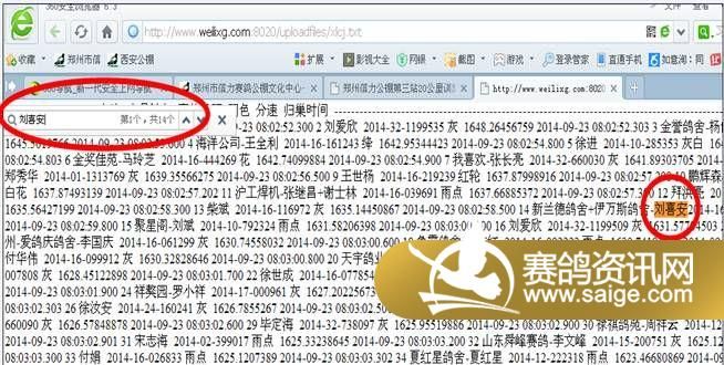 (5)例“会员刘喜安”查询其归巢赛鸽只需Ctrl+F键输入其姓名,黄色为其归巢赛鸽