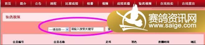 一、 点击“验鸽视频”——在查询栏目选择会员编号或会员名称或足环,输入相应搜索关键字查询,