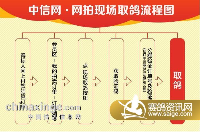 本次拍卖增加了现场取鸽的服务,网上得标的鸽友可以委托朋友代为取鸽现场取鸽。步骤:1、登录会员区结算订单;2、查看订单编号,点现场取鸽按钮,获取订单取鸽验证码,系统会自动发送手机短信到拍卖会员指定手机;3、把验证码报给公棚工作人员,验证成功;4、交接拍卖鸽,签收发放取鸽凭证。