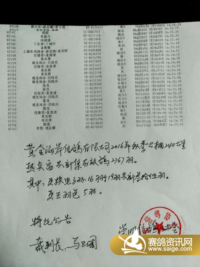 上海黄金海岸240公里集鸽明细展示(裁判长签章)