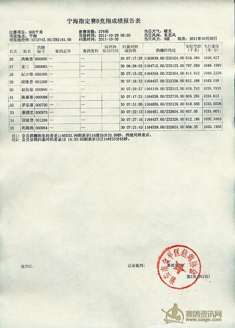 汕头市金平区信鸽协会2011年秋季宁海站成绩
