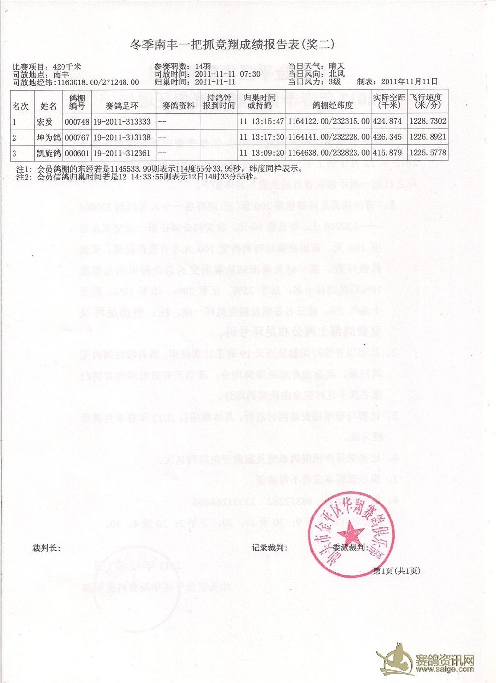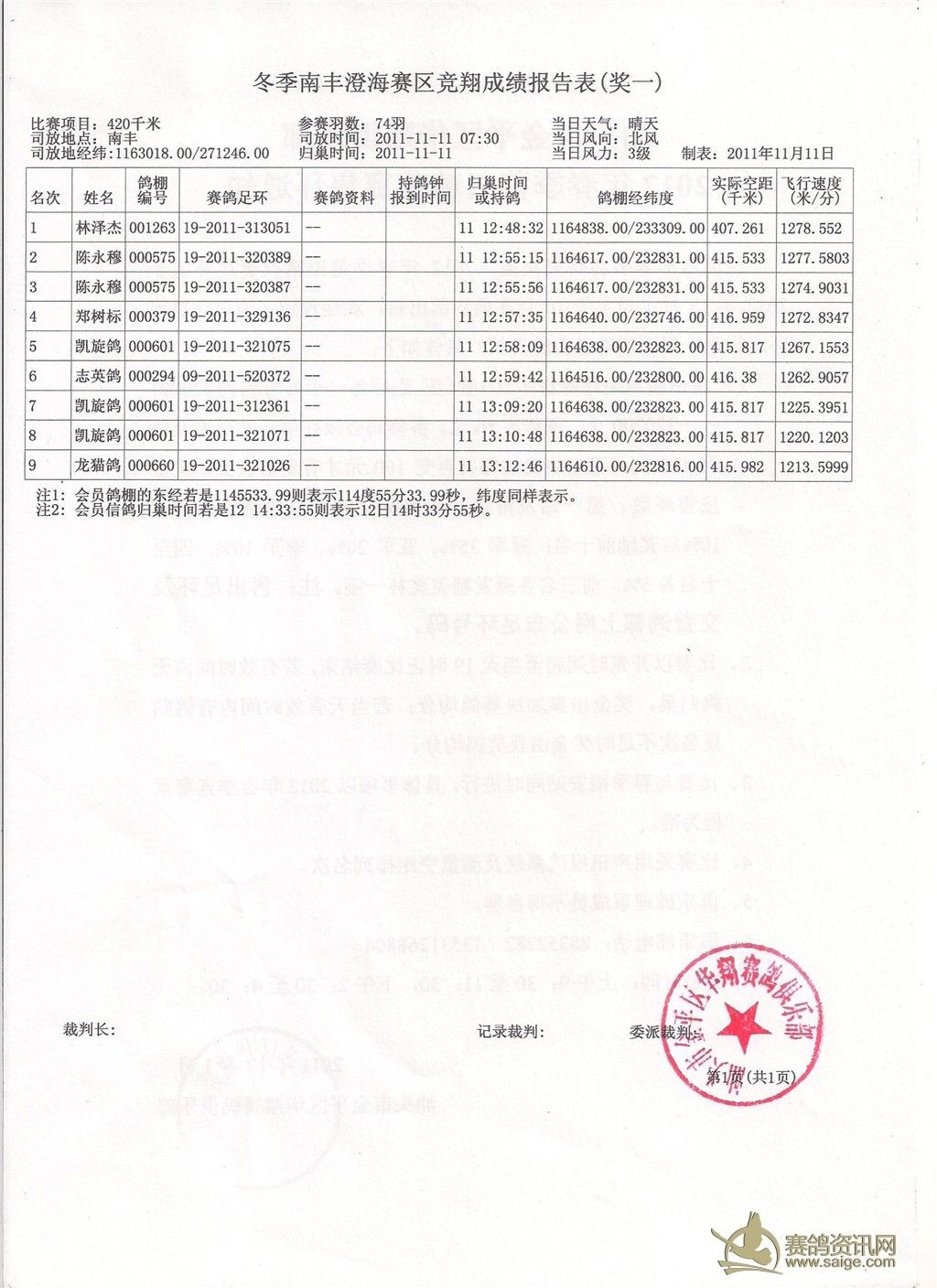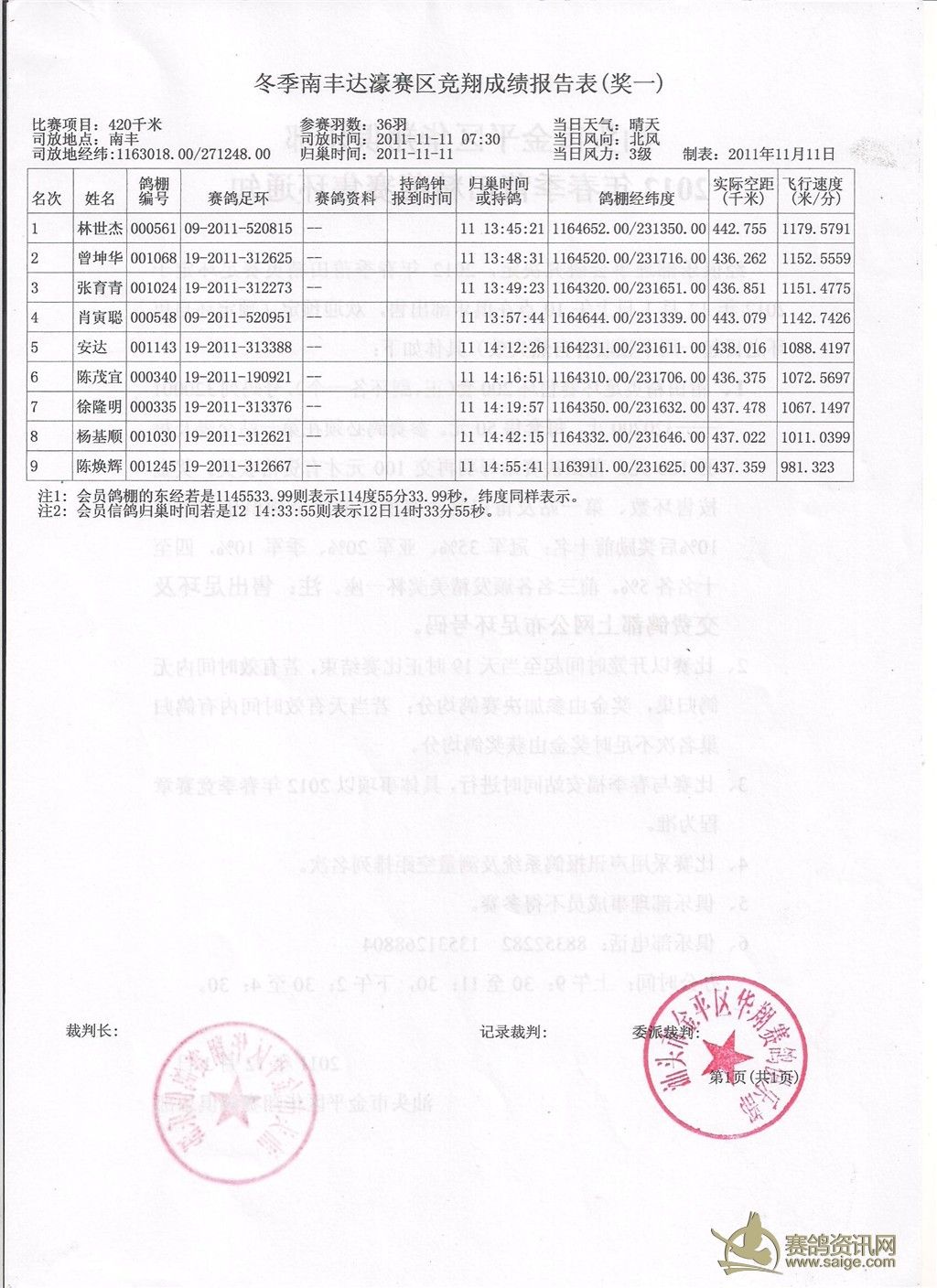 请鸽友校对,5日内无异议成绩生效,颁发奖金。