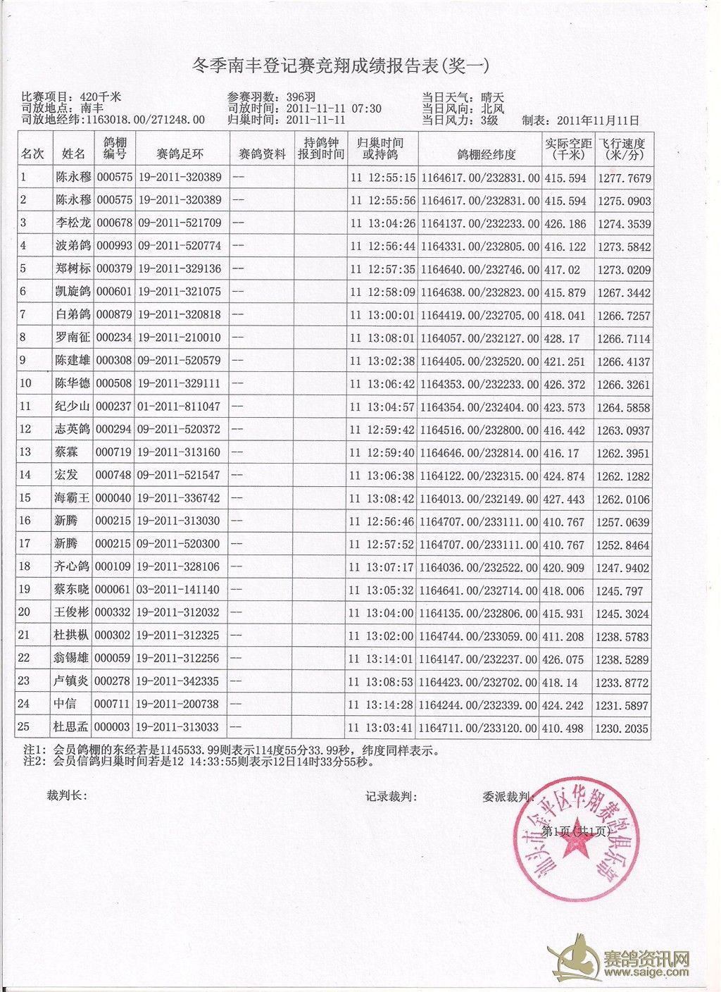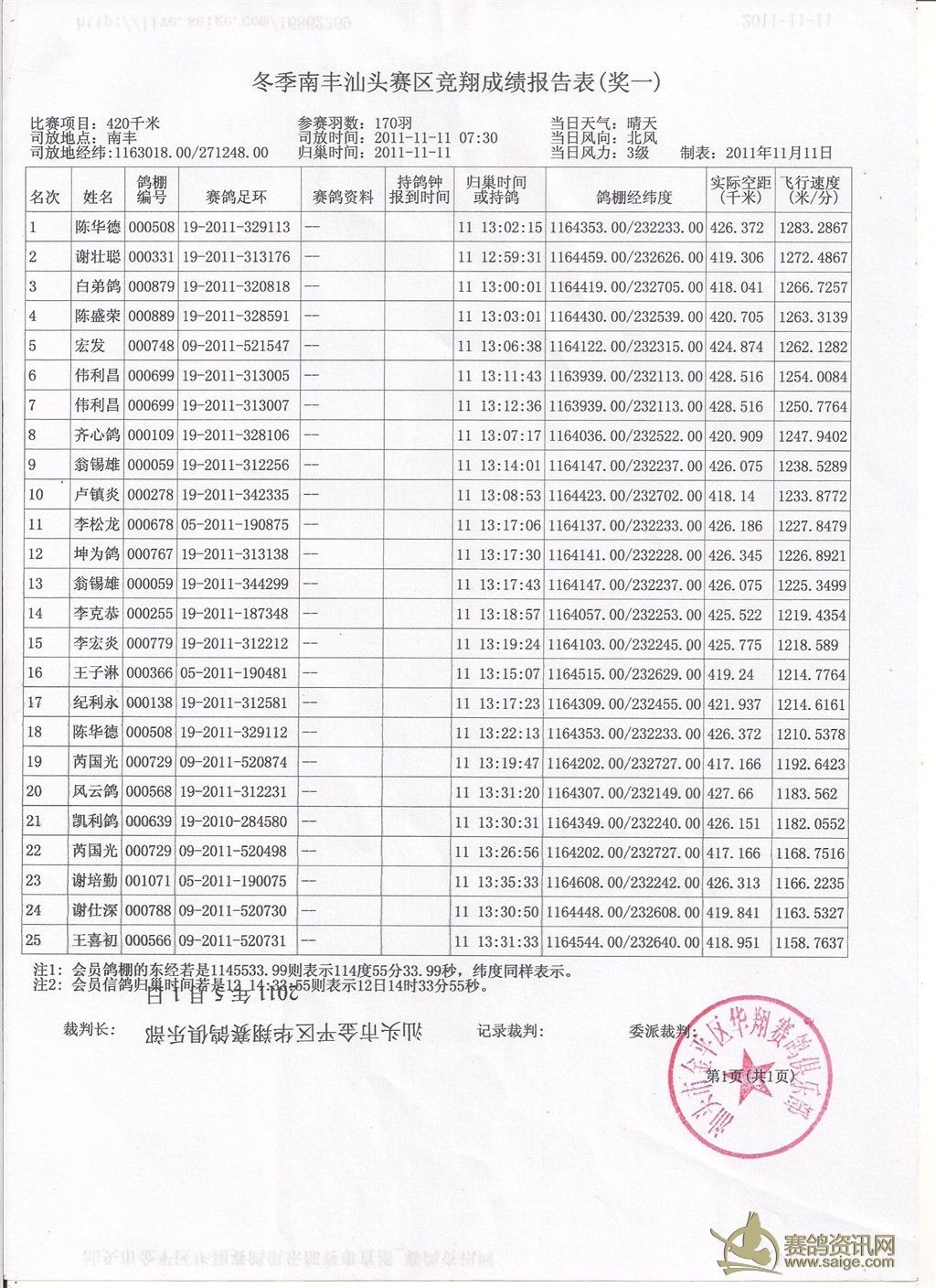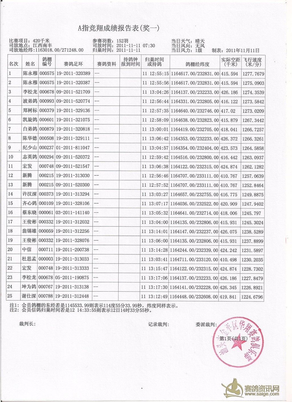 请鸽友校对,5日内无异议成绩生效,颁发奖金。