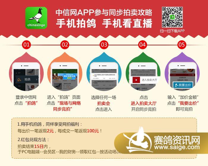 为了让全国各地的鸽友更便捷地参加本公棚秋季获奖鸽的拍卖,本公棚与中信网合作推出“现场与网络同步拍卖服务”,无法前往拍卖会现场的鸽友,可使用电脑或手机登录中信网,观看现场视频直播,并与现场鸽友同步出价,享受足不出户参与竞拍的便利!