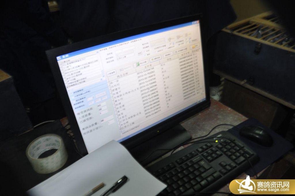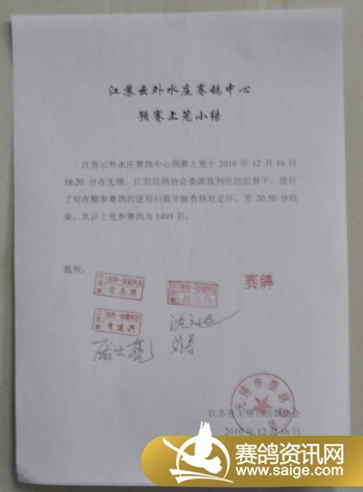 江苏云外水庄赛鸽中心预赛上笼于2010年12月16日18:20分在无锡、江阴信鸽协会委派裁判组的监督下,进行了对在棚参赛鸽的逐羽扫描并抽查核对足环,至20:50分结束,共计上笼参赛鸽为1493羽。