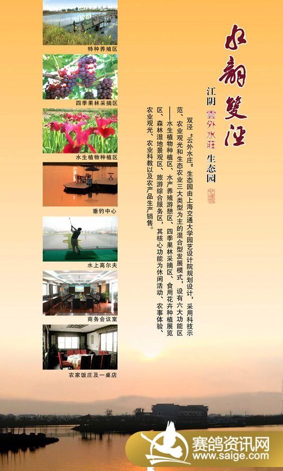 江苏江阴月城双泾云外水庄生态园位于历史悠久的江苏省江阴市月城镇双泾村,占地2500亩,地势平坦,气候宜人,是一个集生态、观光、娱乐与一体的生态园区,云外水庄赛鸽中心就坐落在这环境幽雅的生态园中。