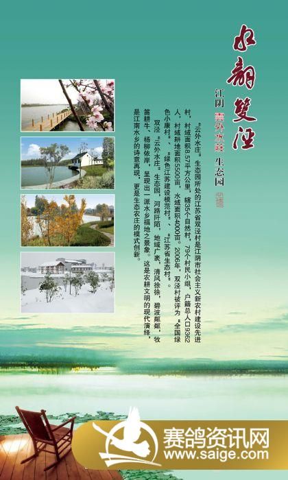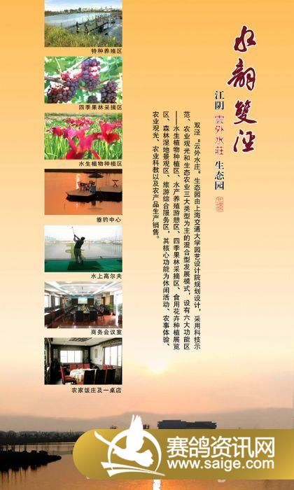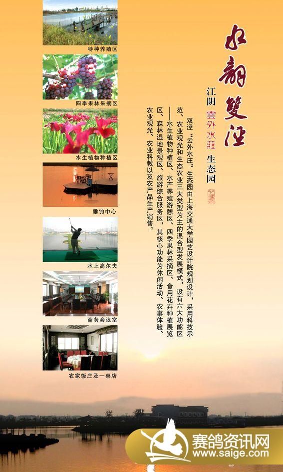 江苏江阴月城双泾云外水庄生态园位于历史悠久的江苏省江阴市月城镇双泾村,占地2500亩,地势平坦,气候宜人,是一个集生态、观光、娱乐与一体的生态园区,云外水庄赛鸽中心就坐落在这环境幽雅的生态园中。