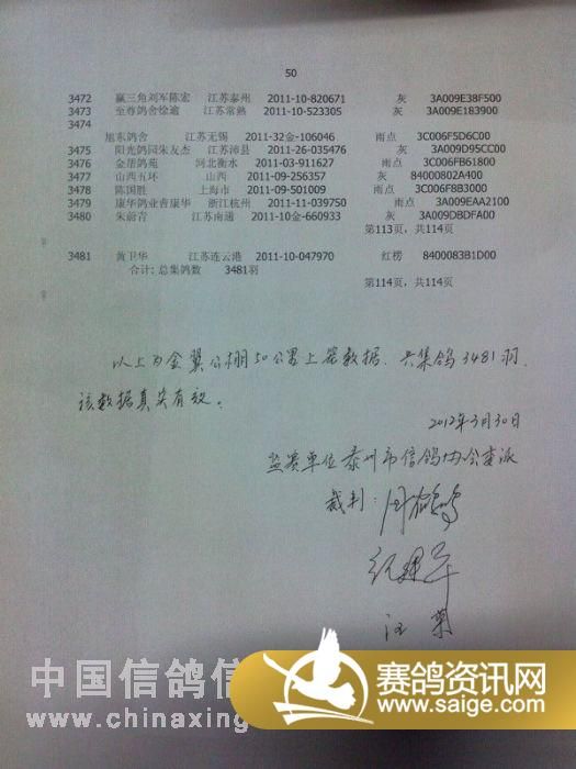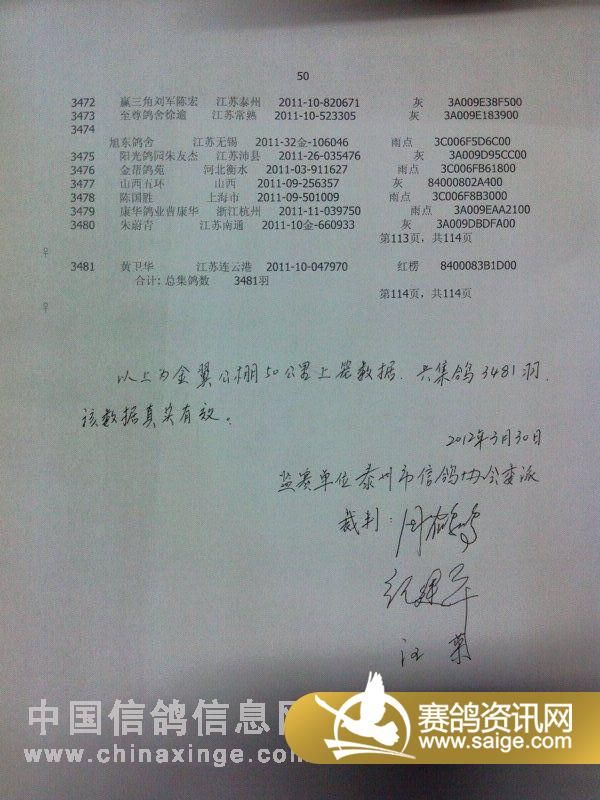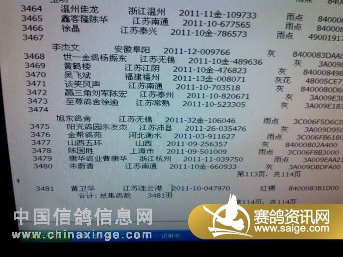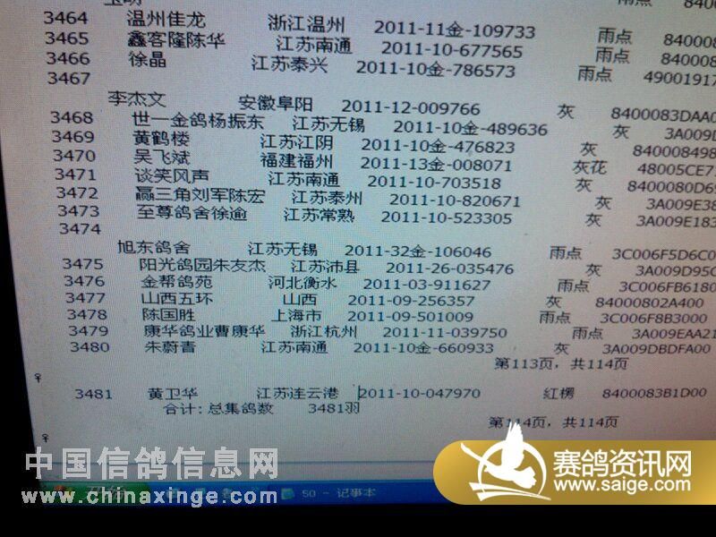 江苏金翼公棚50公里裁判扫描上笼数据(按顺序)