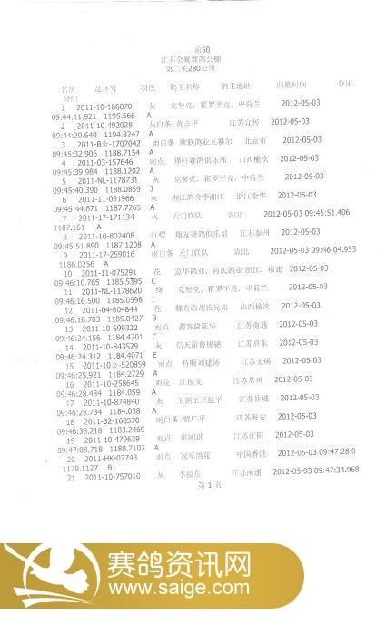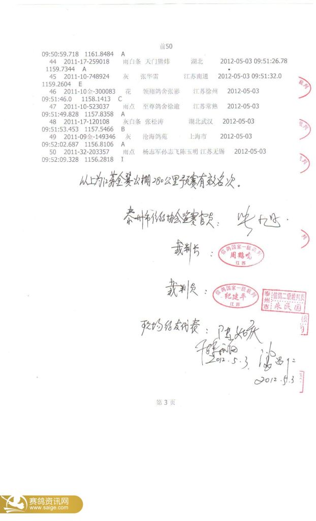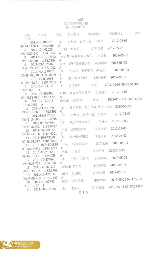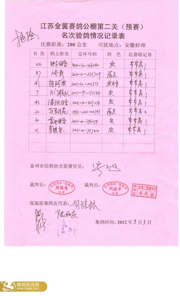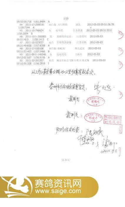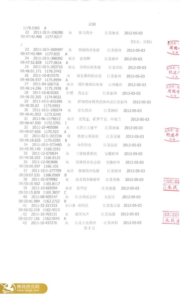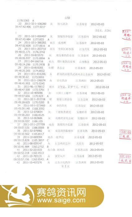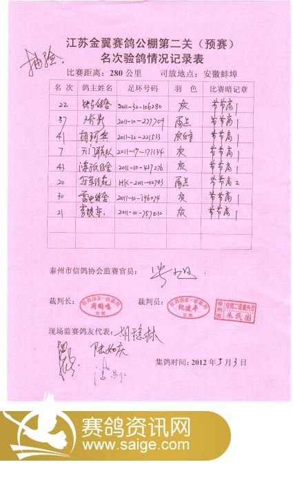 江苏金翼公棚第二关前50名裁判鸽友确认