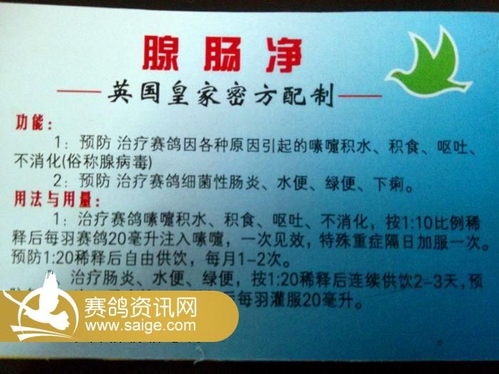 | 各位鸽友: 为解决大家信鸽训放期间的腺病毒和上笼应急反应,以及交叉感染引起的赛鸽涨归、呕吐、水便、绿便等胃肠道疾病,本公棚特别从欧洲引进纯原装进口“腺肠净”奉献给大家。详情参照一下说明。需要购买请与我们联系。5瓶以上全国范围免邮费。 联系电话:13805267636 汇款方式:农行卡号:622845 342001 7930010 开户名:蒋金余 建行卡号:622700 131476 0138443 开户名:蒋金余