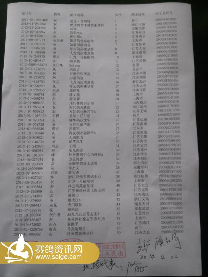第一关前50名现场裁判和鸽友盖章,签字