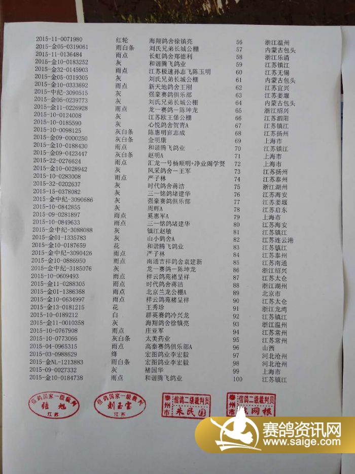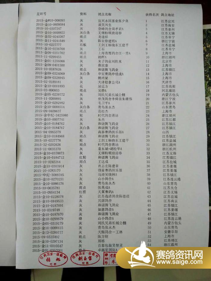 江苏金翼公棚第三关400公里前100名