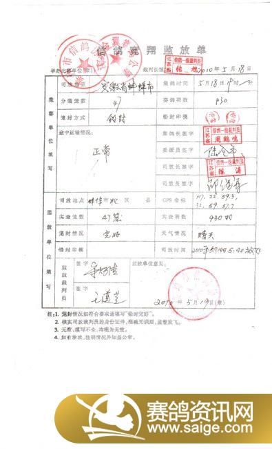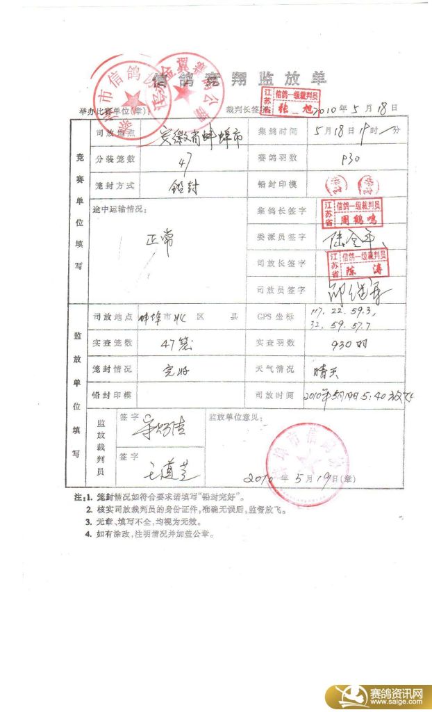 江苏金翼赛鸽公棚第二关监放单