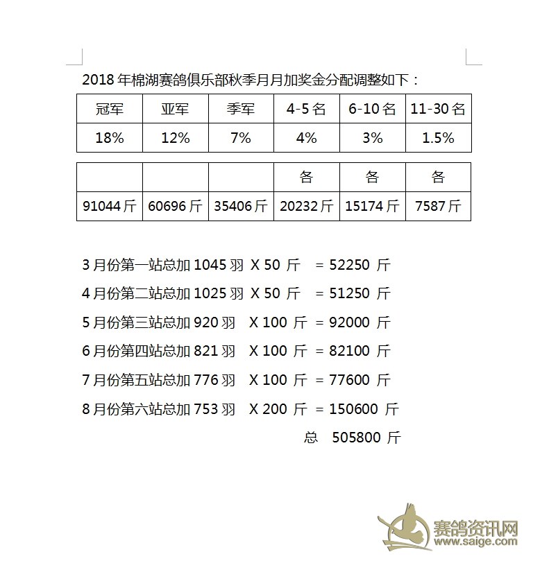 2018年棉湖赛鸽俱乐部秋季月月加奖金分配调整如下