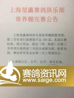 上海堃瀛国际赛鸽俱乐部寄养棚完赛公告