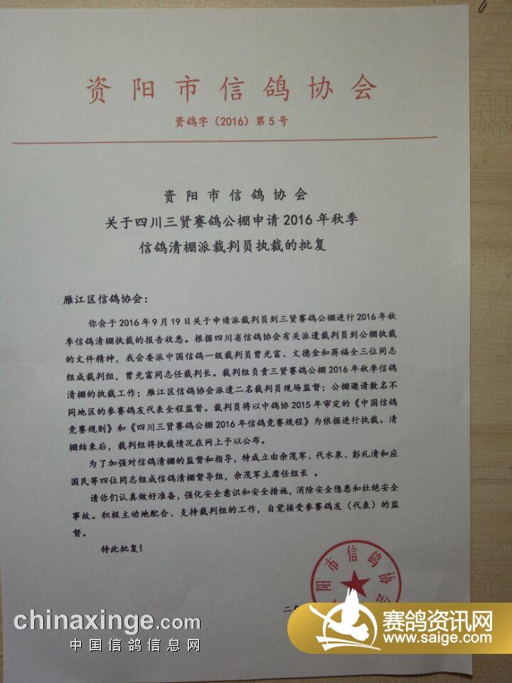 资阳市信鸽协会关于三贤公棚清棚执裁批复