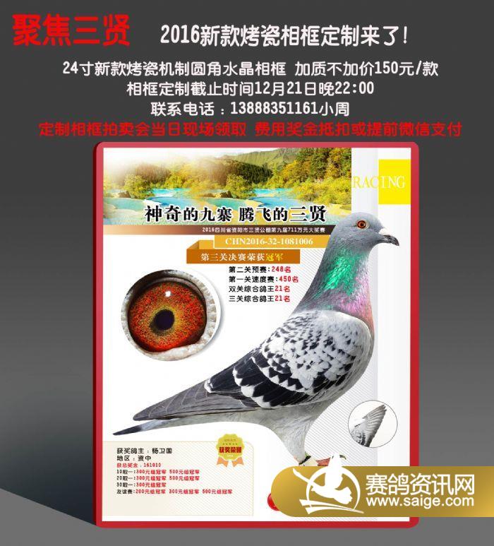 | 尊敬的鸽友,2016三贤公棚免费提供前400名获奖鸽拍照上传,决赛前十、双关/三关鸽王前十由公棚免费提供24寸烤瓷相框(注:相框由拍卖会成交鸽主所有),其余获奖鸽不予提供烤瓷相框,如需定制请与下方联系人报名予以制作,费用自理。现照片陆续上传中...