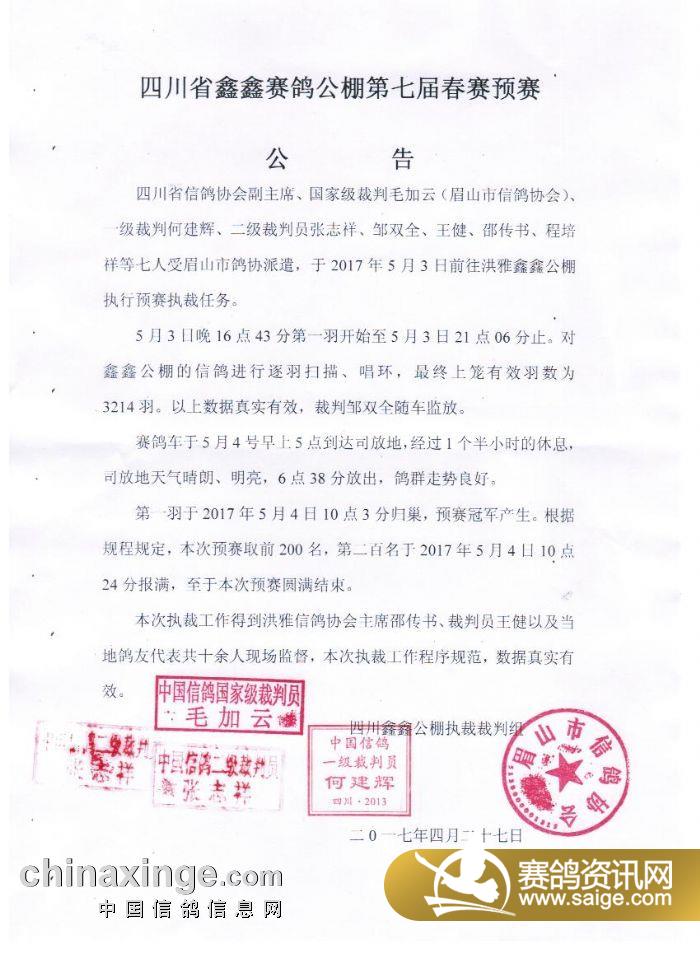 四川省鑫鑫赛鸽公棚第七届春赛预赛公告