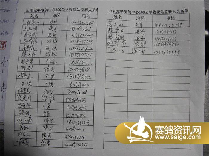 山东龙畅赛鸽中心100公里收费站监赛人员签字名单