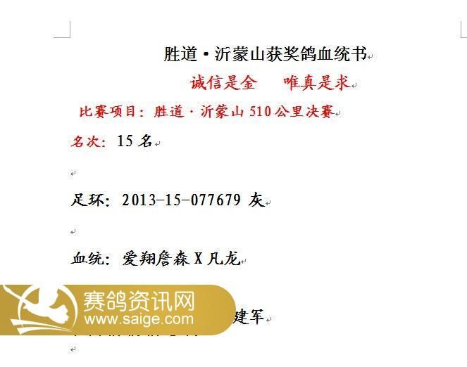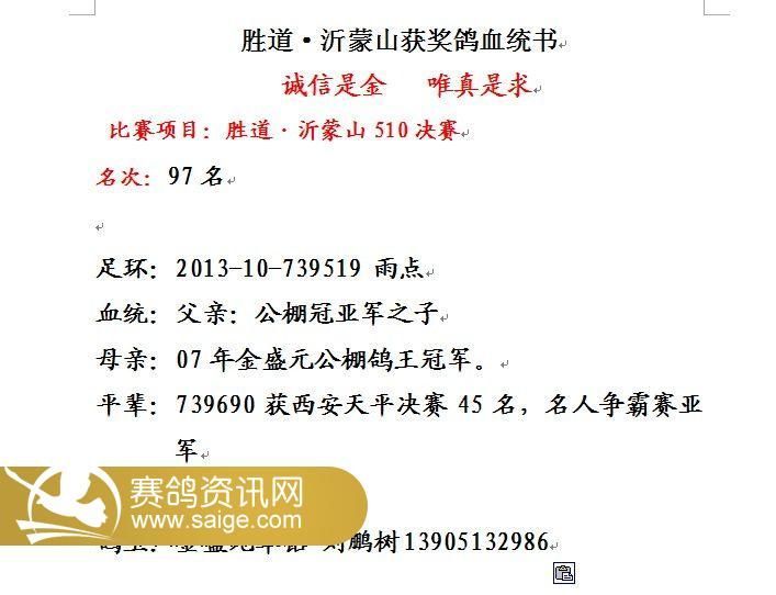 胜道·沂蒙山401-500名获奖鸽风采照