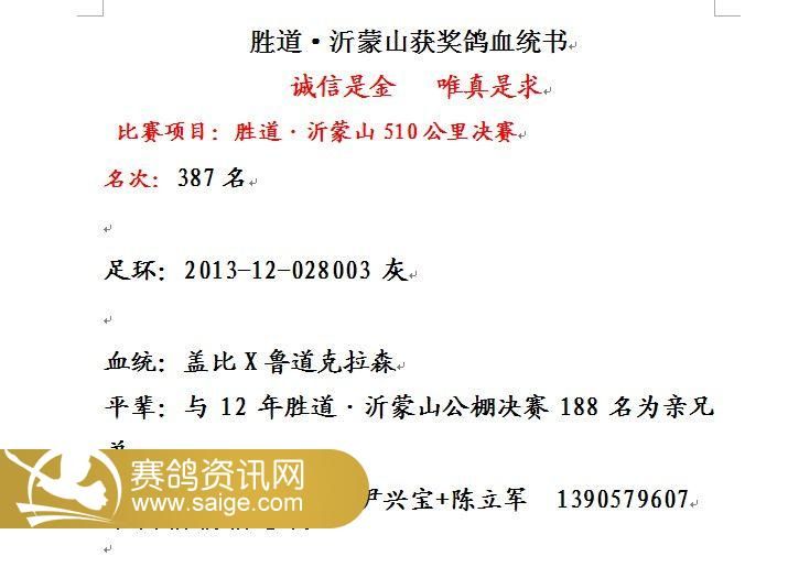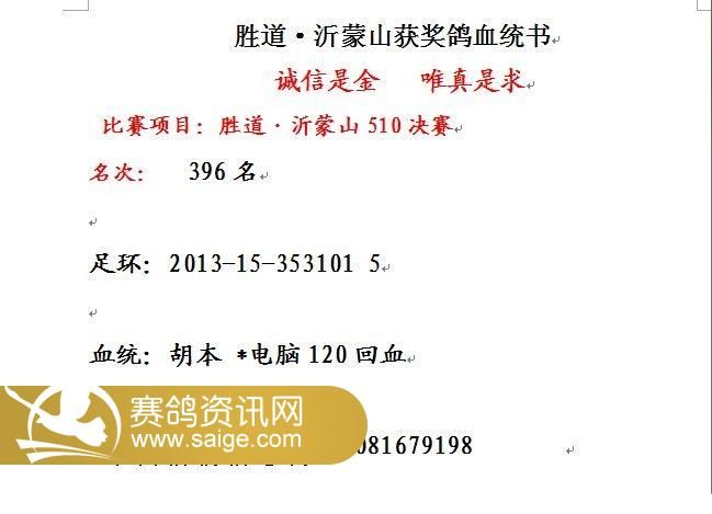 胜道·沂蒙山301-400名获奖鸽风采照