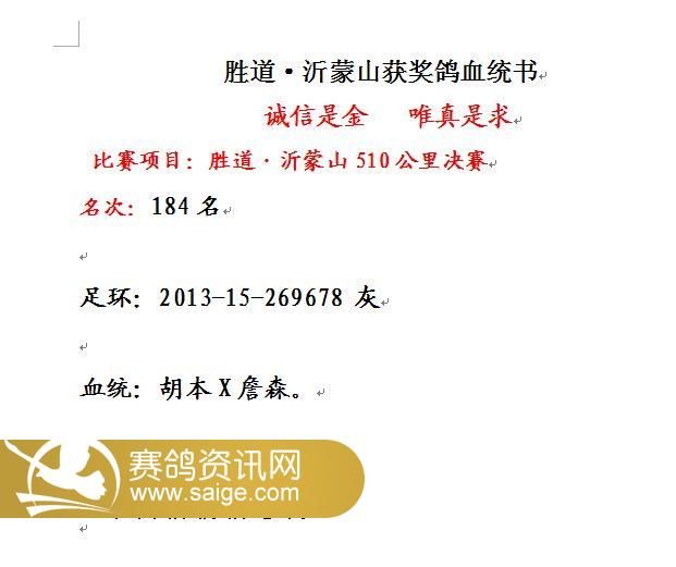 免责声明:本网凡是由用户发布的文字、图片、音视频等资料,其真实性、准确性和合法性由信息发布人自行承担,并负法律责任。赛鸽资讯网不提供任何保证,并不承担任何法律责任。