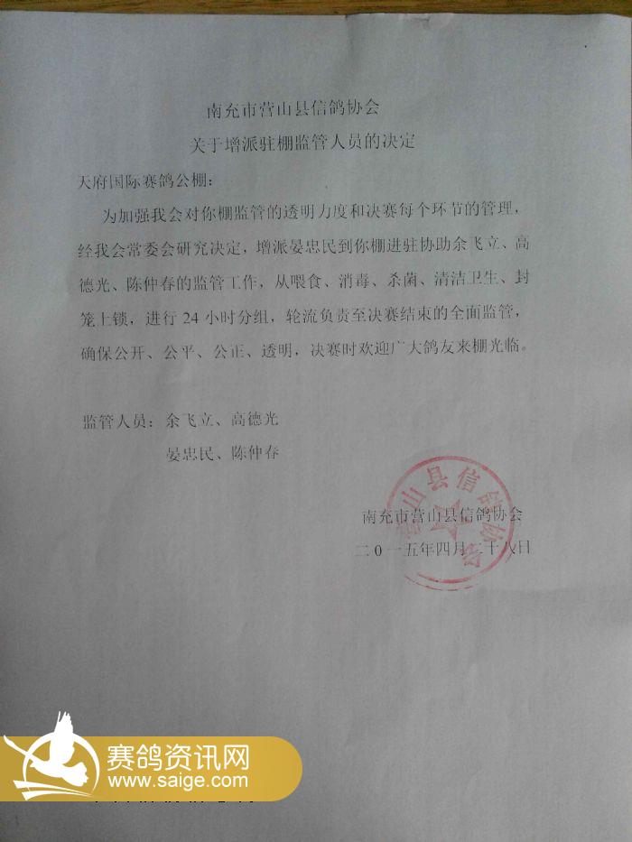 南充市营山县信鸽协会关于增派监管人员决定