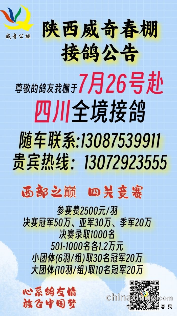 陕西威奇春棚7月26日赴四川全境接鸽公告