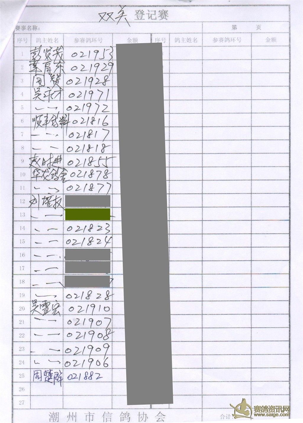 秋季双关环在龙海站起滚筒确认号码,每站都需校对足环号码,盖印确认上笼,不准拿回。印章不齐全取消成绩。