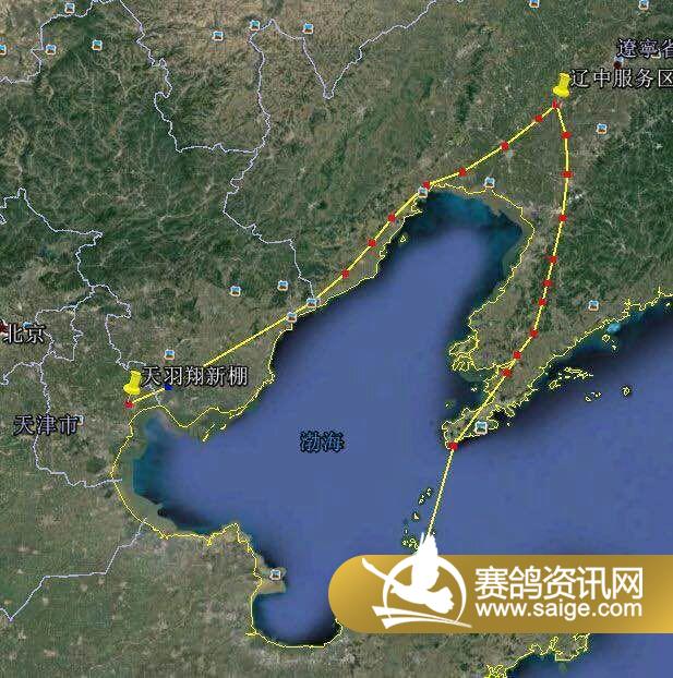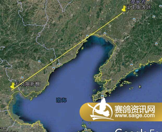 下面我们再来看一下公棚的赛线走向。天羽翔公棚的赛线是东北赛线,五百公里的司放地在位于辽中县的辽中服务区。我们在卫星图上把这两个点连成一条线,再加以观察,我们不难发现,鸽子会沿着锦州、秦皇岛、公棚的大致连线上飞回天羽翔公棚。