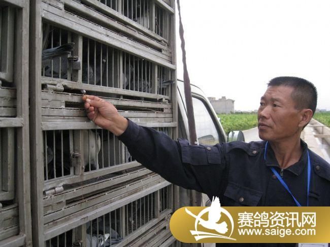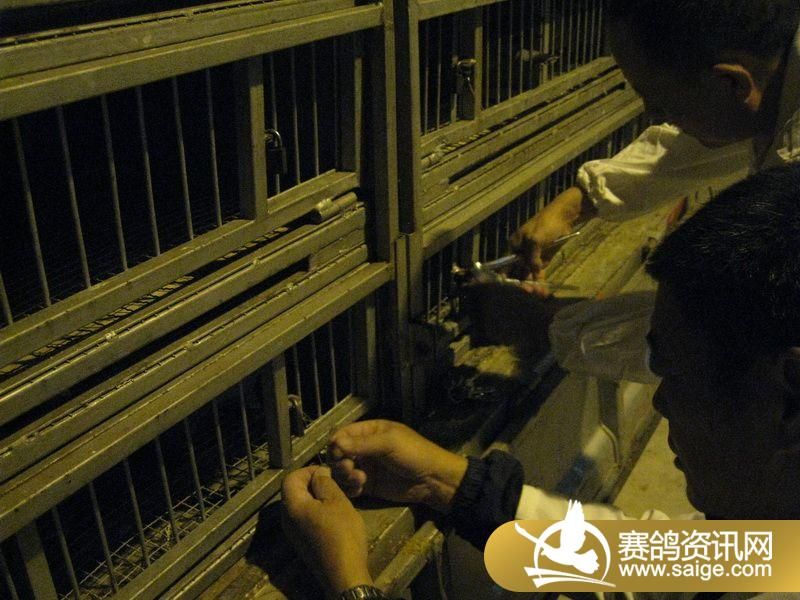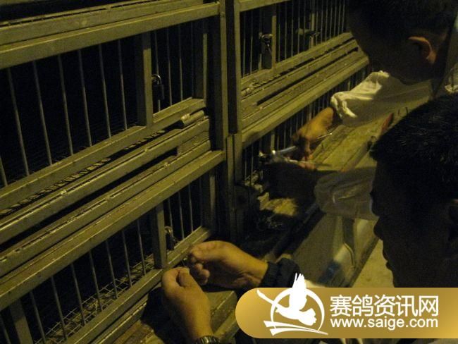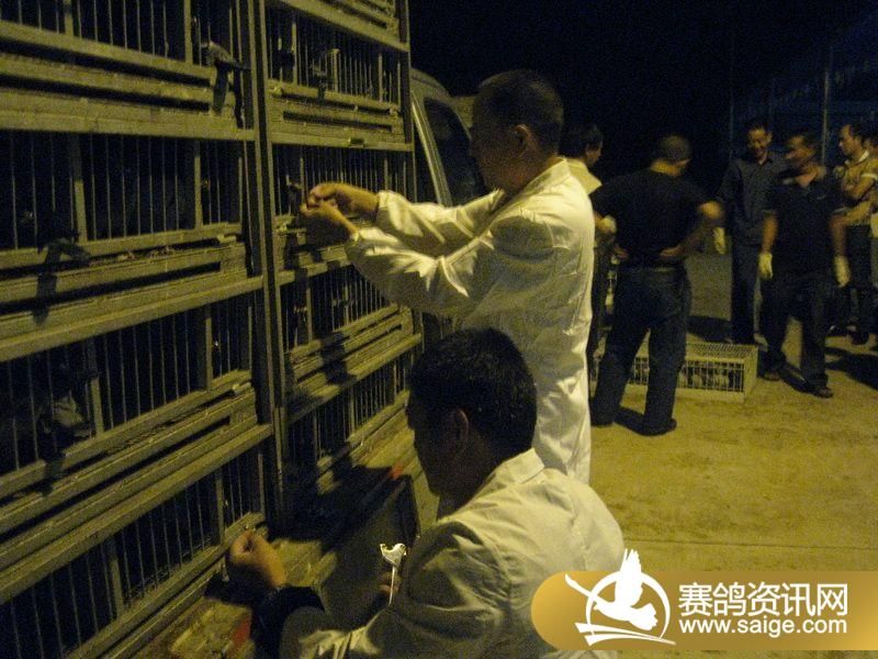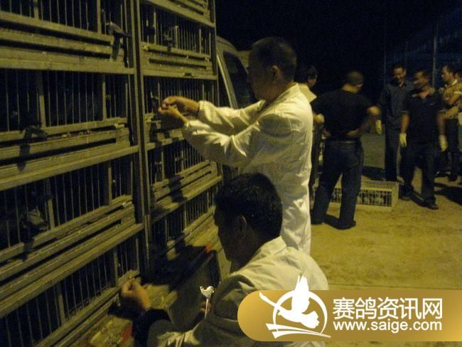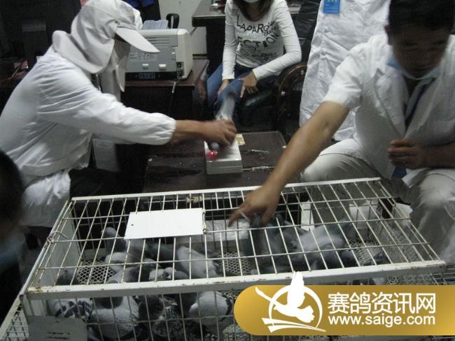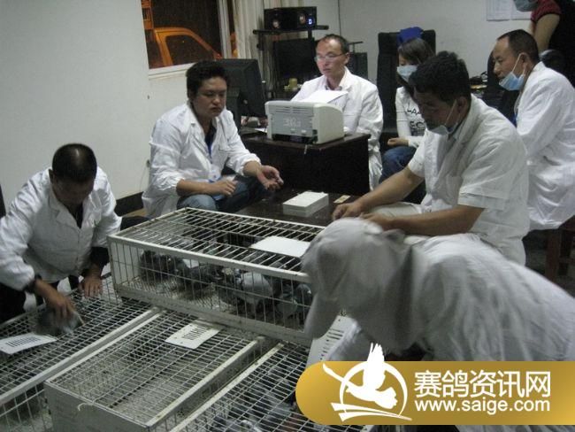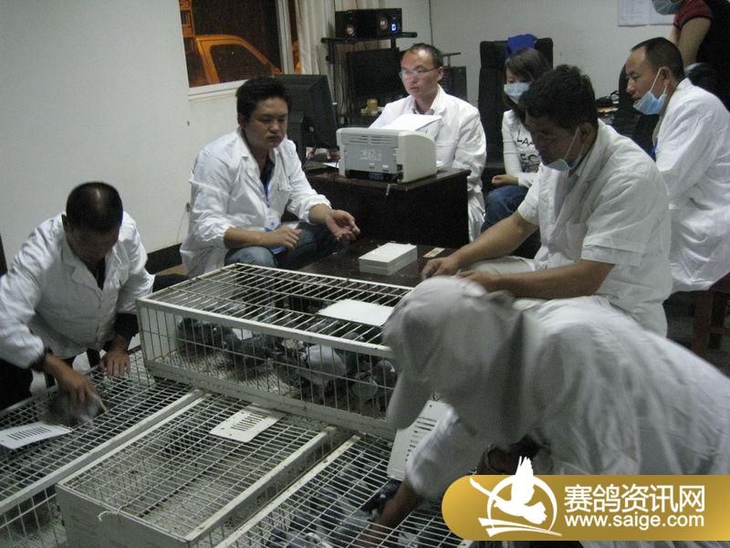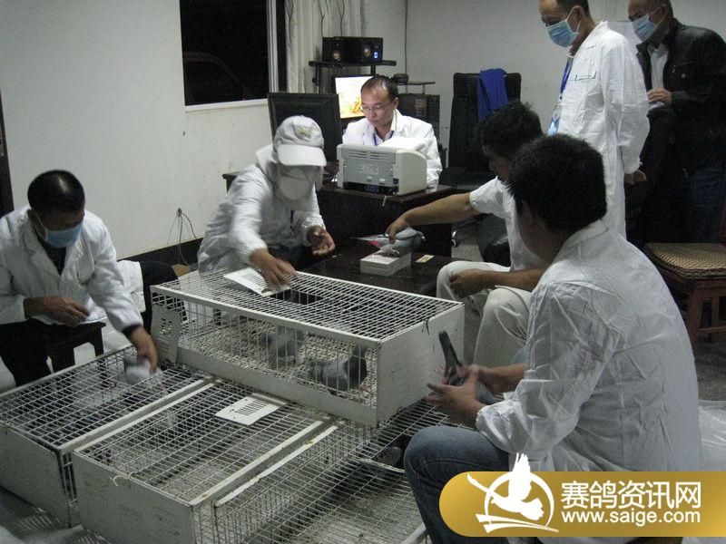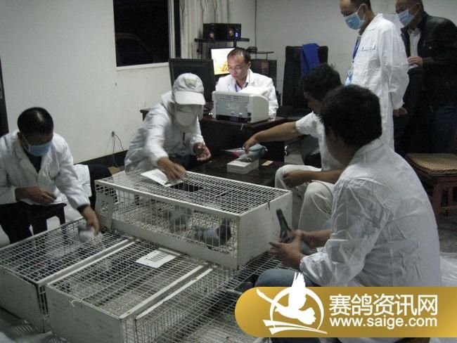 裁判将赛鸽逐一扫描上笼