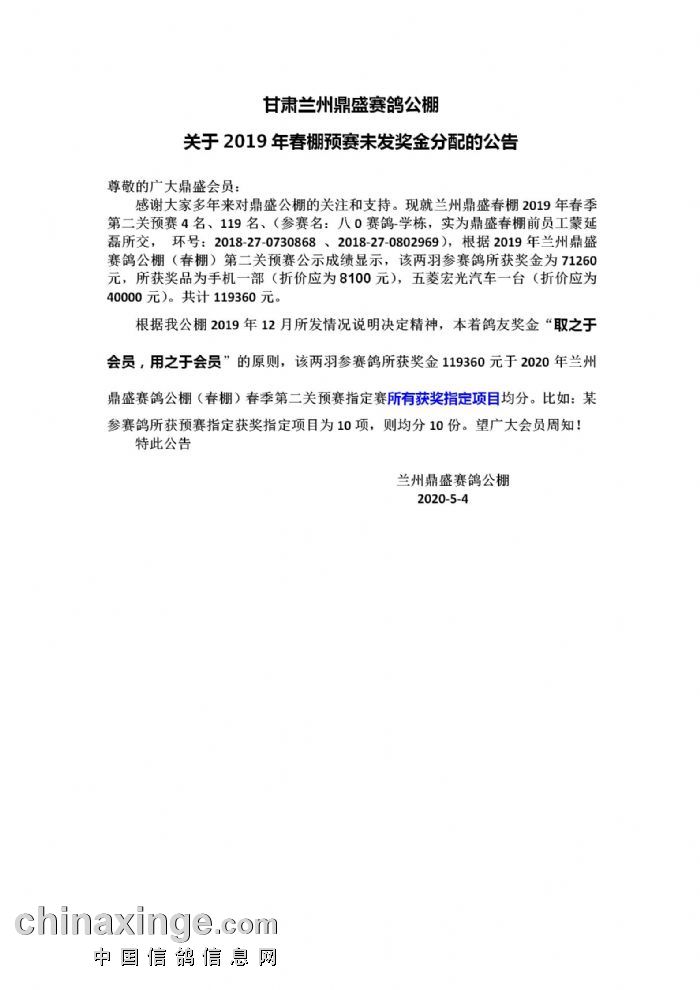 甘肃兰州鼎盛公棚(2020春)第一关指定赛奖金发放公告