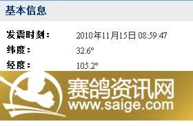 从前天开始,今天已是摇第三次大的地震了。特别是刚才9点几分这个,来的之猛不亚于5.12当天,有点像楼房突然就掉了下去样。恐怖啊,前天的凭经验有4级,今天的刚出来了,4,5级,中心就在乔庄。---------四川新闻网成都11月15日快讯:2010年11月15日08:59:47,四川省广元市青川县发生4.5级地震。成都震感明显。地震大概持续了7、8秒时间。