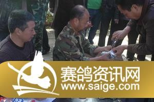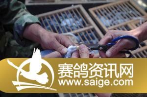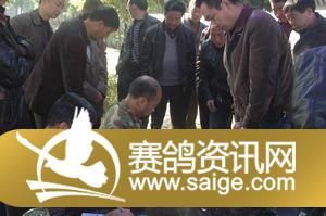 裁判认真给未缴费鸽进行剪环,广大鸽友观看
