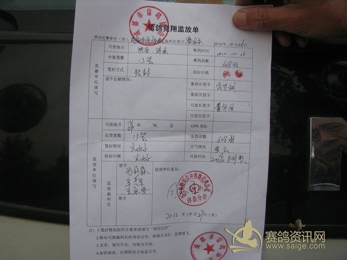 洋县铁路鸽会裁判长冯新森《13509167384》给监放单签字