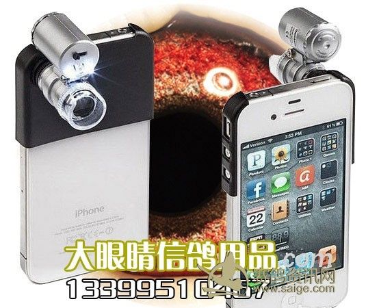 此款鸽眼放大镜能让您惊叹于鸽眼微观世界的美妙,试想一下,当鸽眼被放大60倍,您和鸽友能一起现场观赏研究切磋鸽眼遗传。。育种奥秘。。会是一个什么场景?当放大镜遇上iPhone。。一切皆有可能!!!