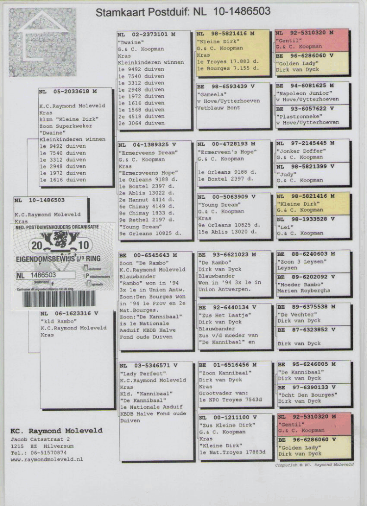 雷蒙为了确保自己的鸽子都是带有优良血统,他加入了N.O.O.K(荷兰养鸽中心)。这个中心就是专门对那些血统遭到质疑的赛鸽进行鉴定,然后给那些赛鸽买卖者提供证明。这个中心就是赛鸽质量判定的权威。如果一个购买者得到了这个中心的证明,那就表明他即将购买的鸽子绝对是正统的血统。N.O.O.K与DNA鉴定实验室(位于瓦赫宁恩)的凡.哈林恩有协议。在交付高于一定价位的鸽子时,一定要携有DNA鉴定证书。
