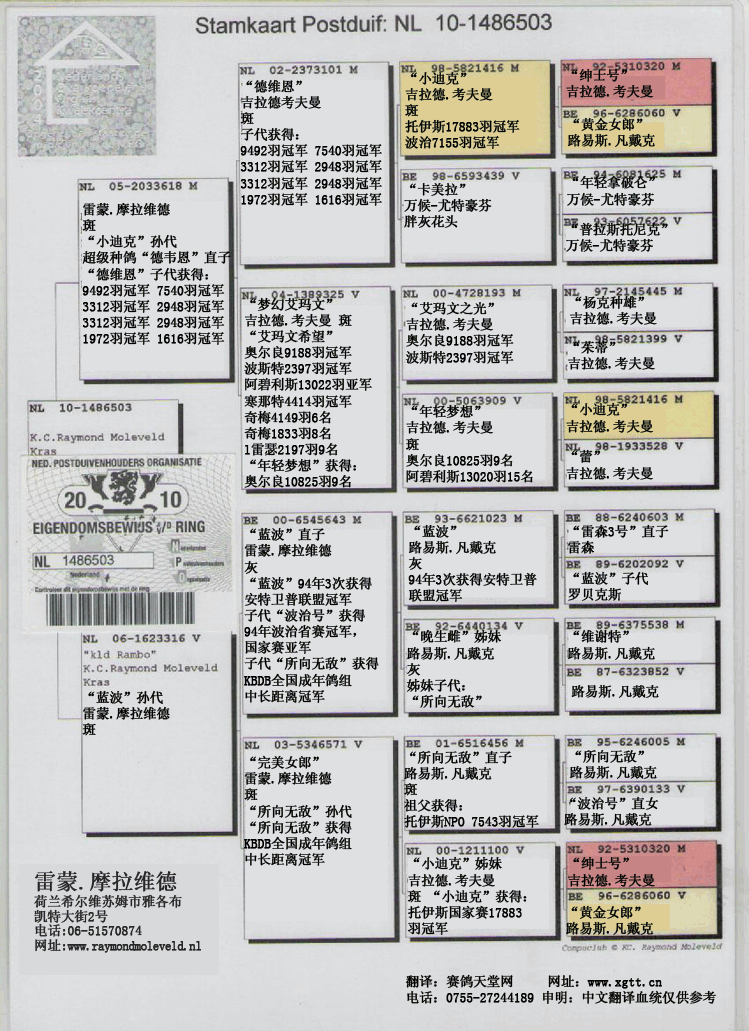 (“黄金夫人”雷蒙.摩拉维德作出,斑,02年贝洛尼NPO冠军,33043羽鸽王8名)